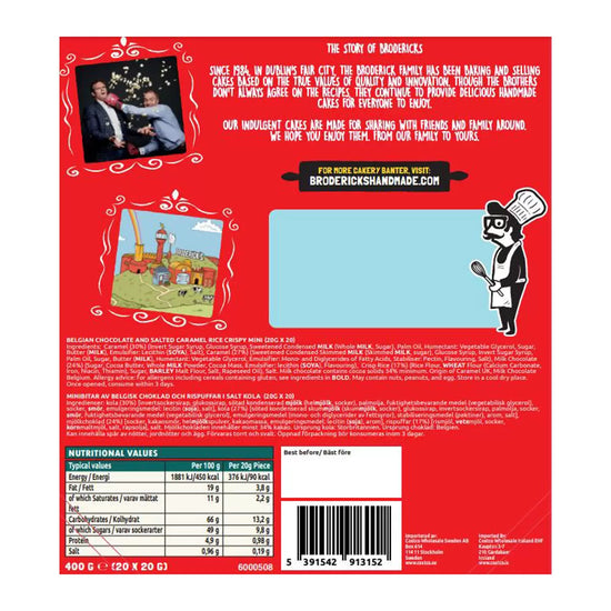 Broderick Brothers Salted Caramel Crispy Chunks are handmade with Belgian Milk Chocolate from sustainably sourced cocoa and Signature Caramel with a touch of salt. Packed with crunchy crispies, drizzled with salted caramel and fully enrobed in Belgian chocolate, the delicious chunks are crafted in the Dublin bakery. Perfect for those who believe in love at first bite, sharing with friends or keeping a delicious treat for yourself!